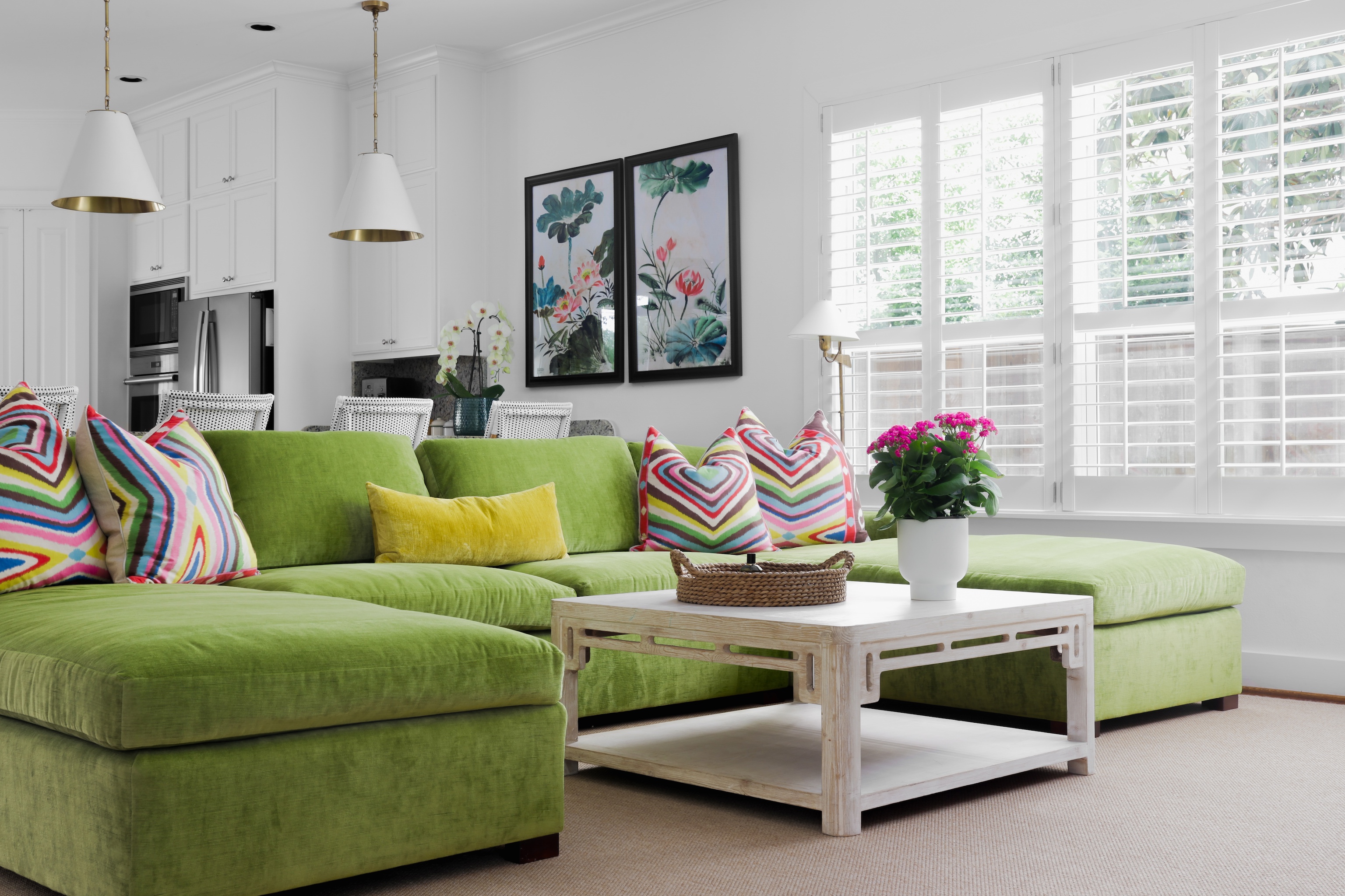 As you enter, you are greeted with a bright, cheerful and spacious open living, dining and kitchen area. Gorgeous wood floors, custom white shutters, touches of wallpaper and a fun pop of color on the stair runner.