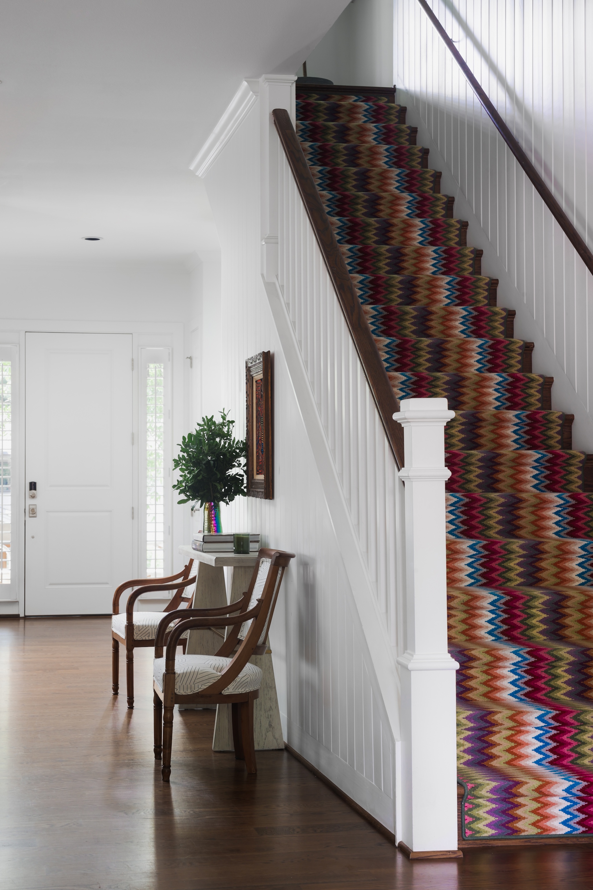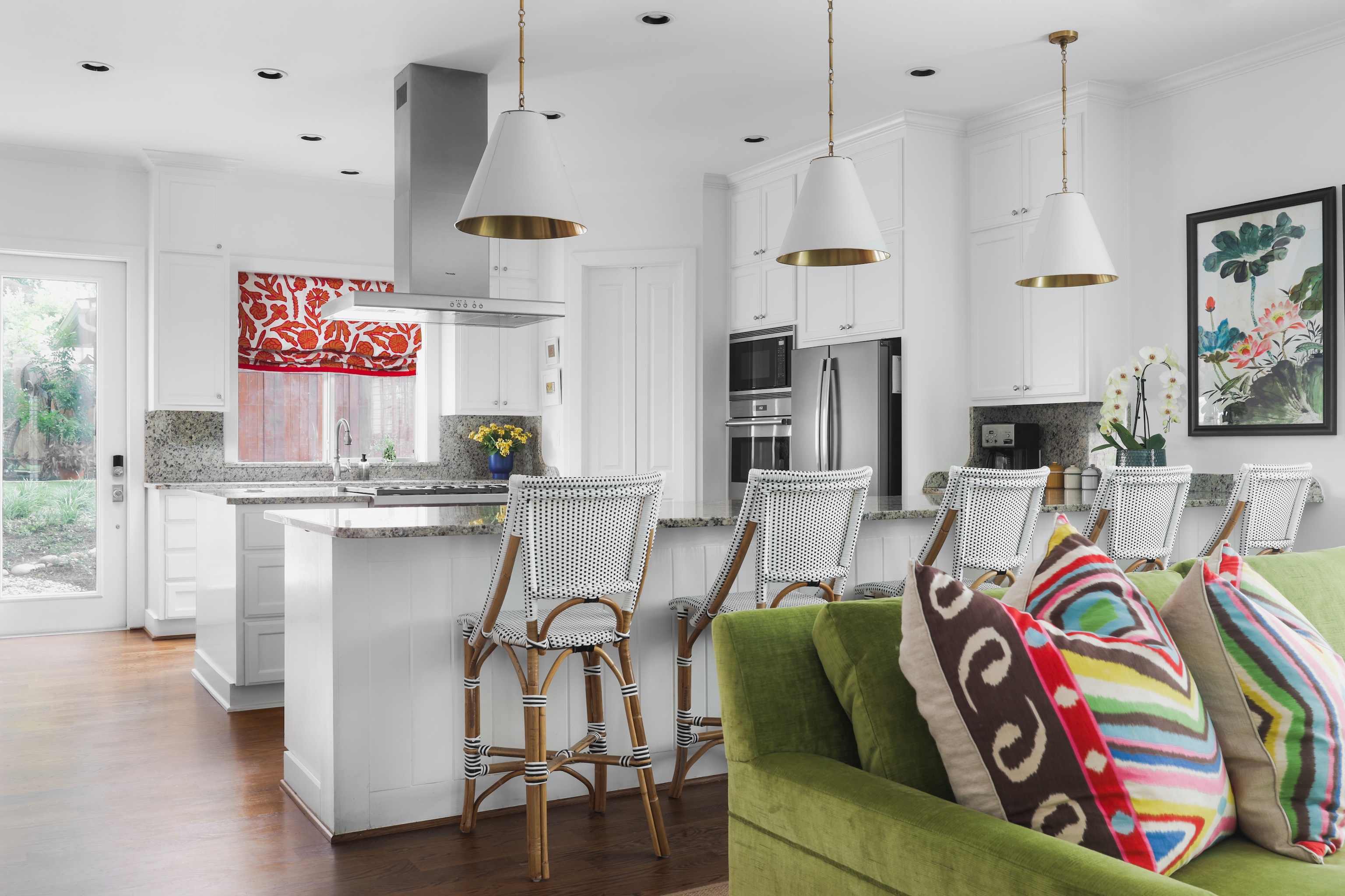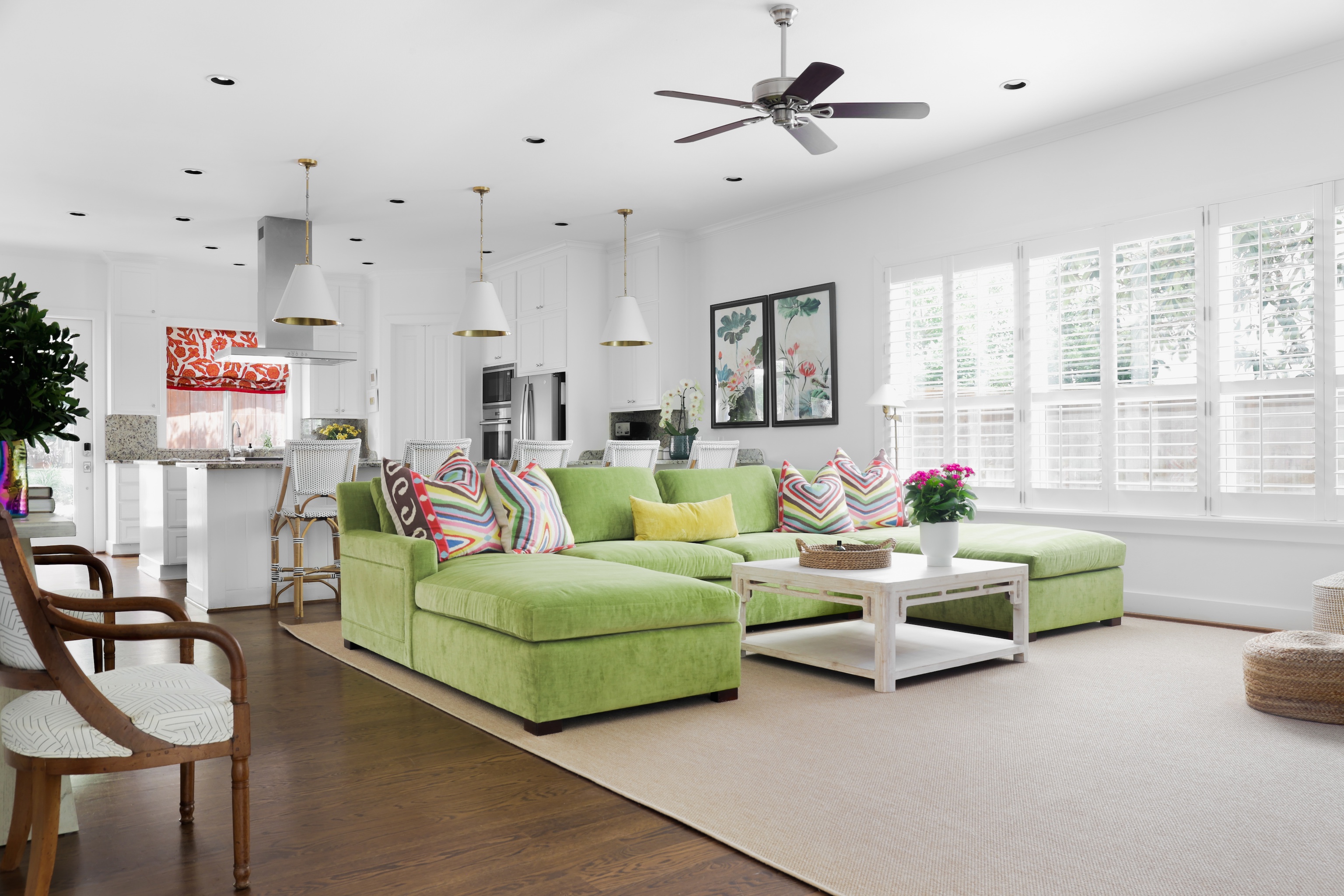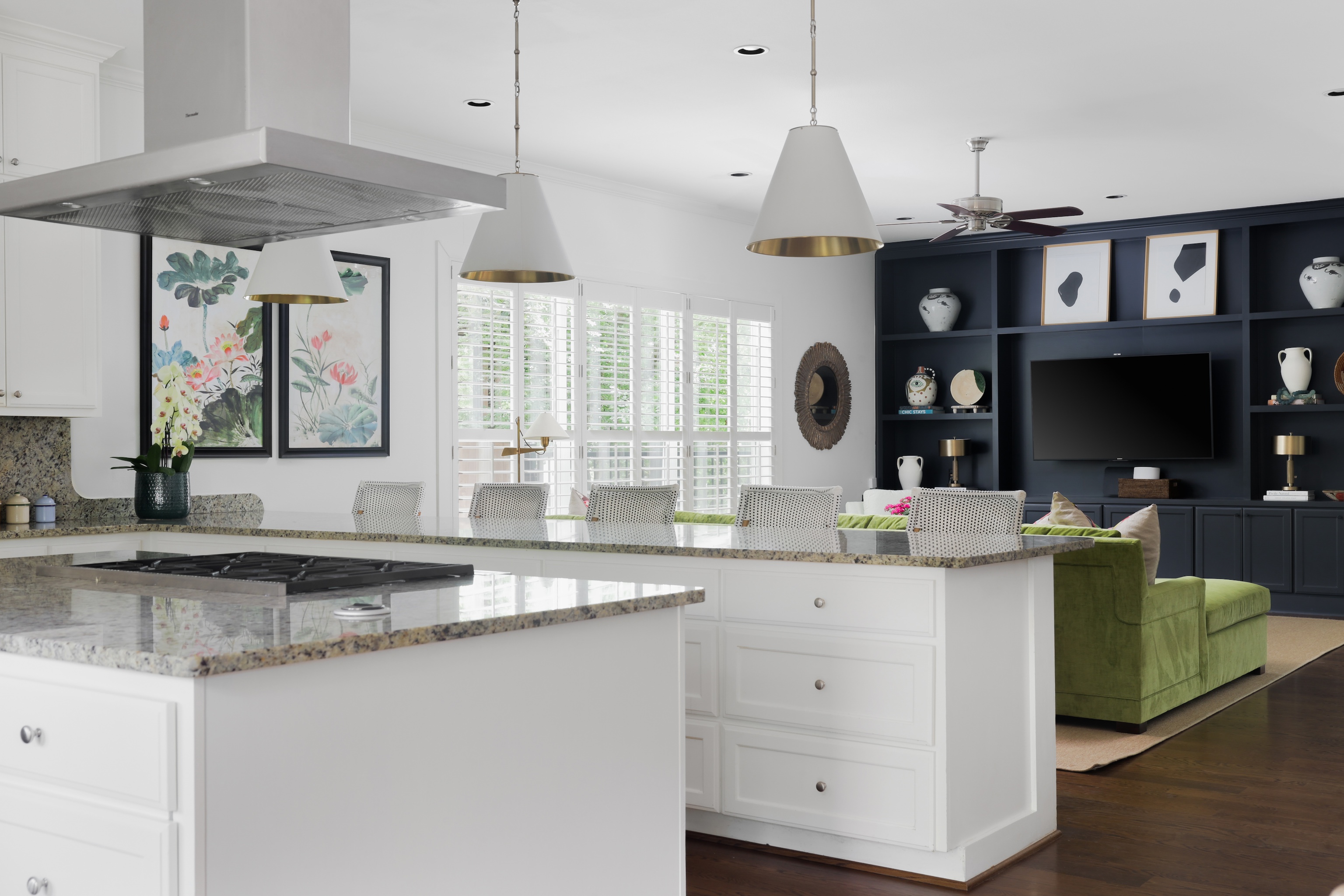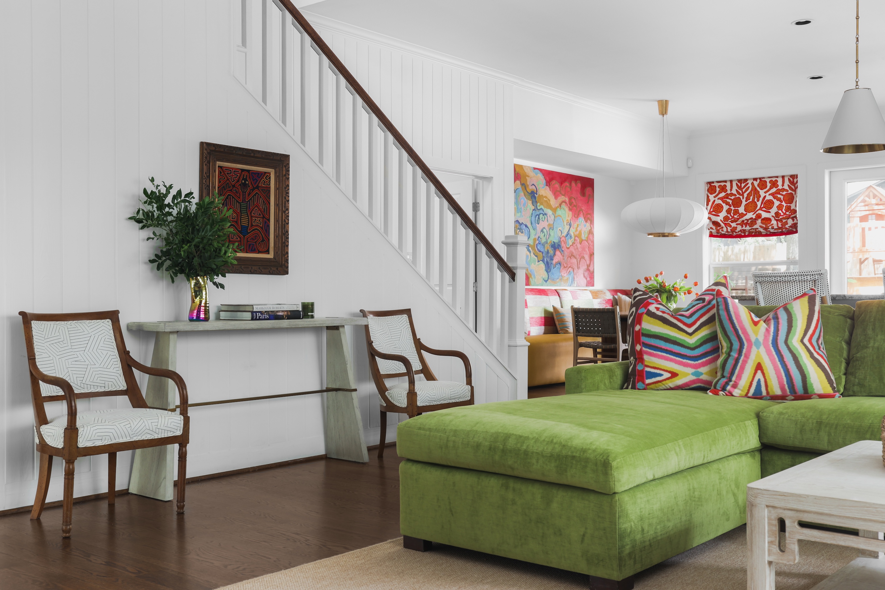 As you enter, you are greeted with a bright, cheerful and spacious open living, dining and kitchen area. Gorgeous wood floors, custom white shutters, touches of wallpaper and a fun pop of color on the stair runner.