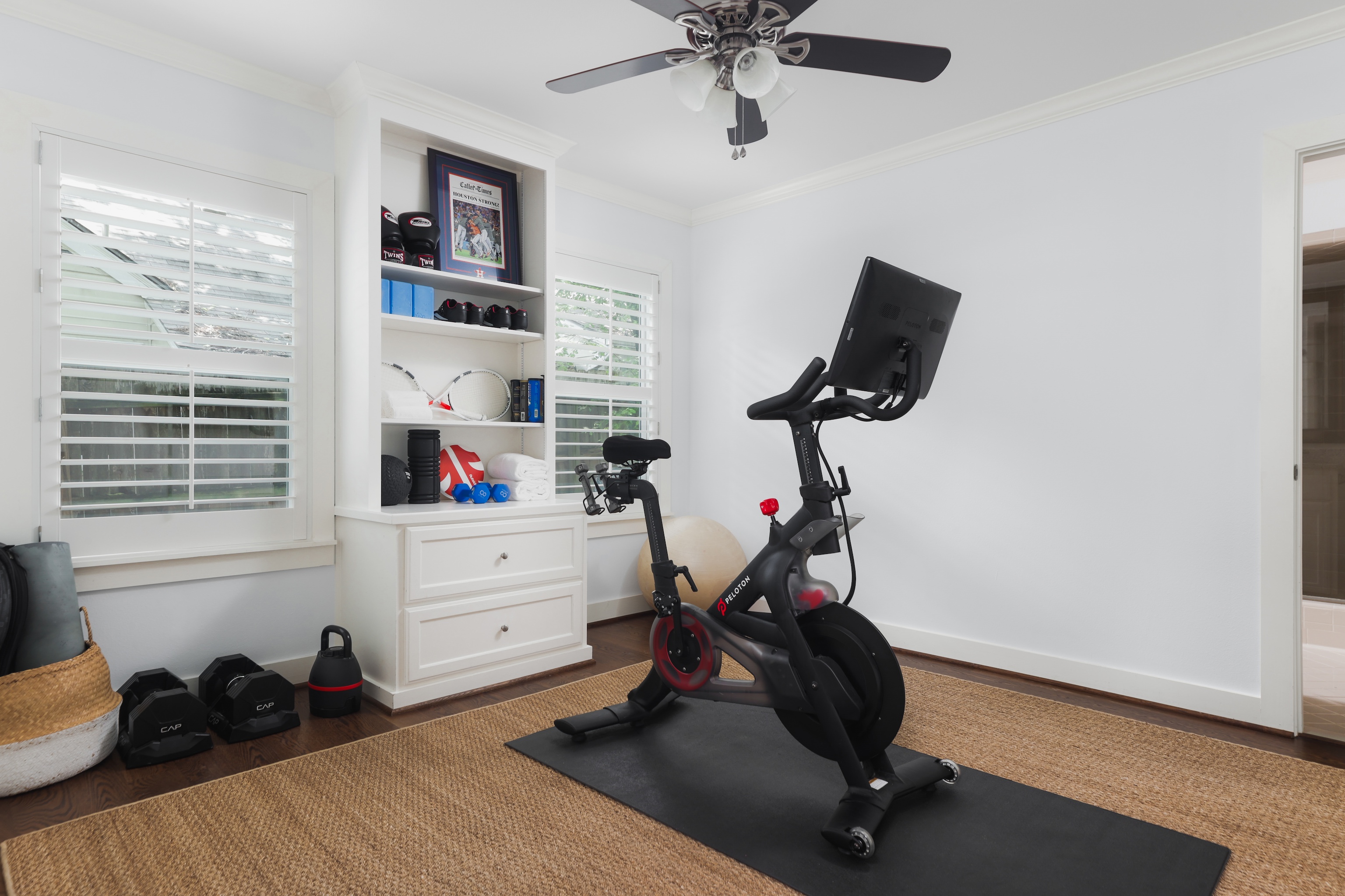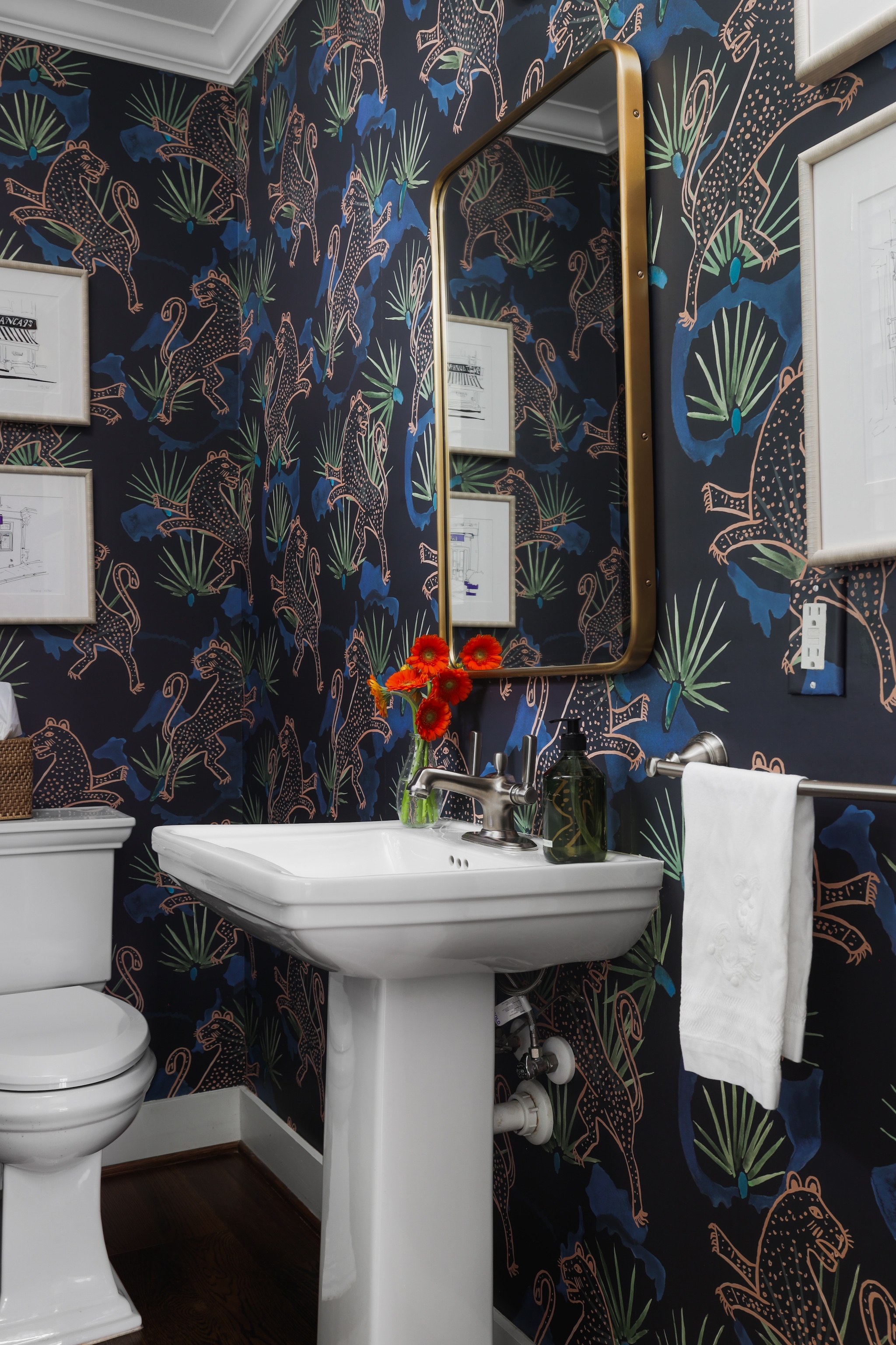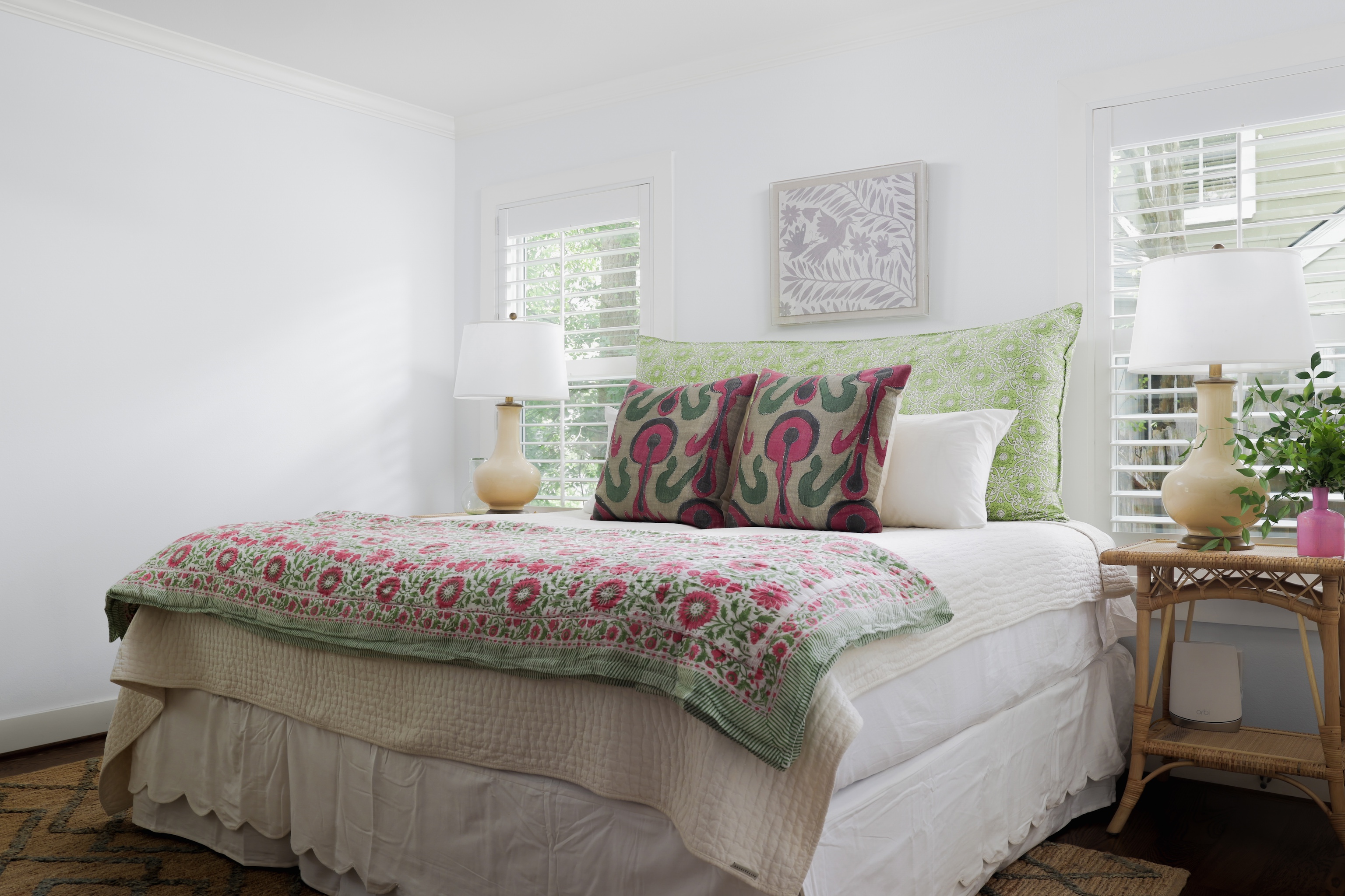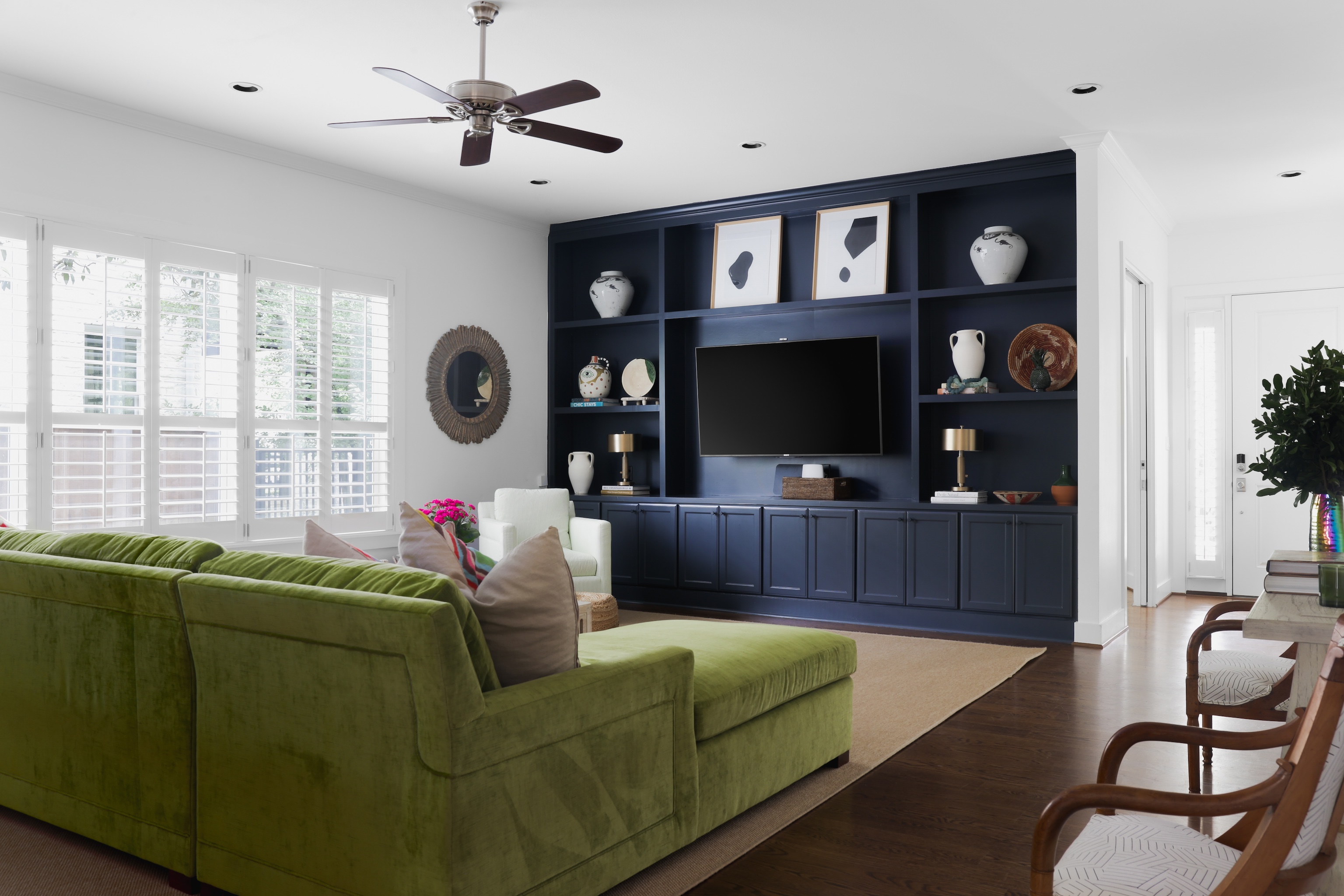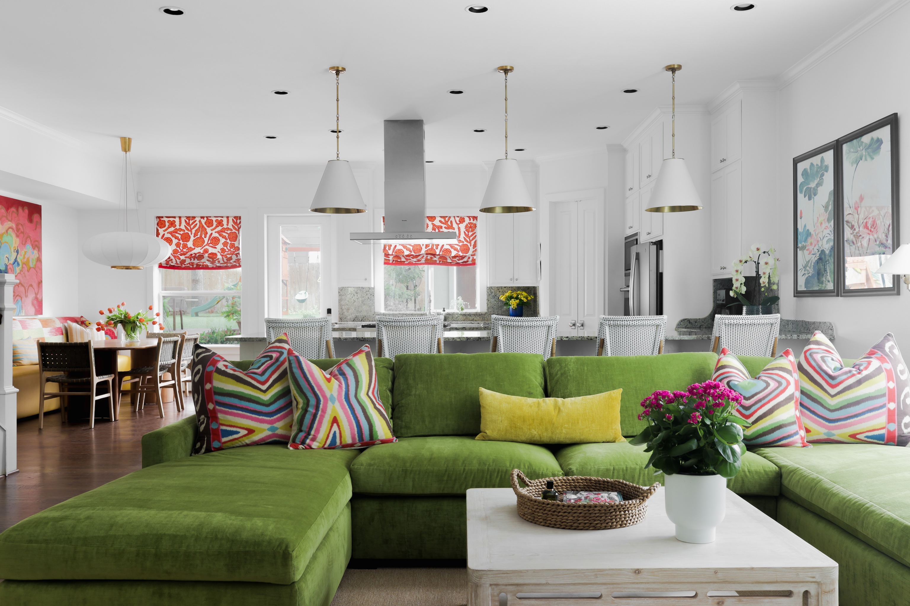 As you enter, you are greeted with a bright, cheerful and spacious open living, dining and kitchen area. Gorgeous wood floors, custom white shutters, touches of wallpaper and a fun pop of color on the stair runner.