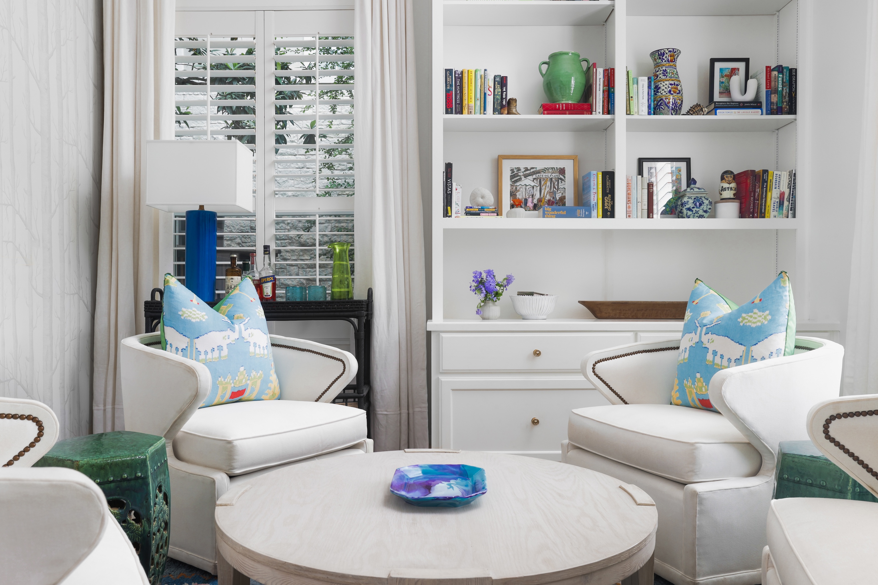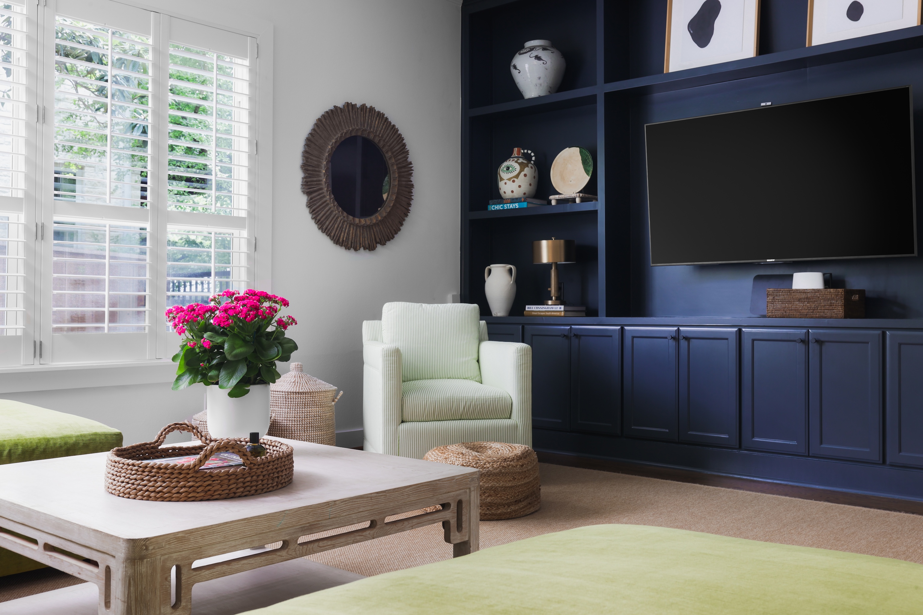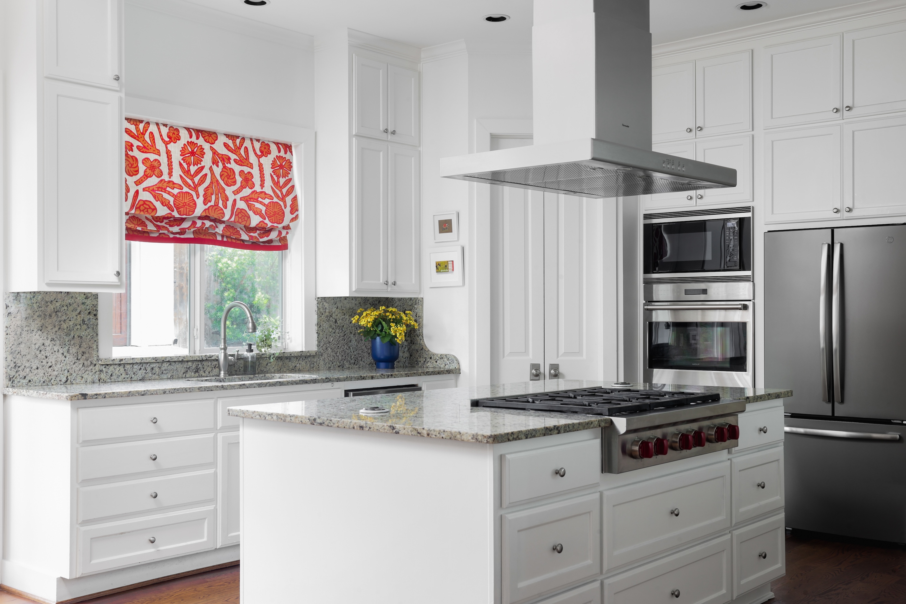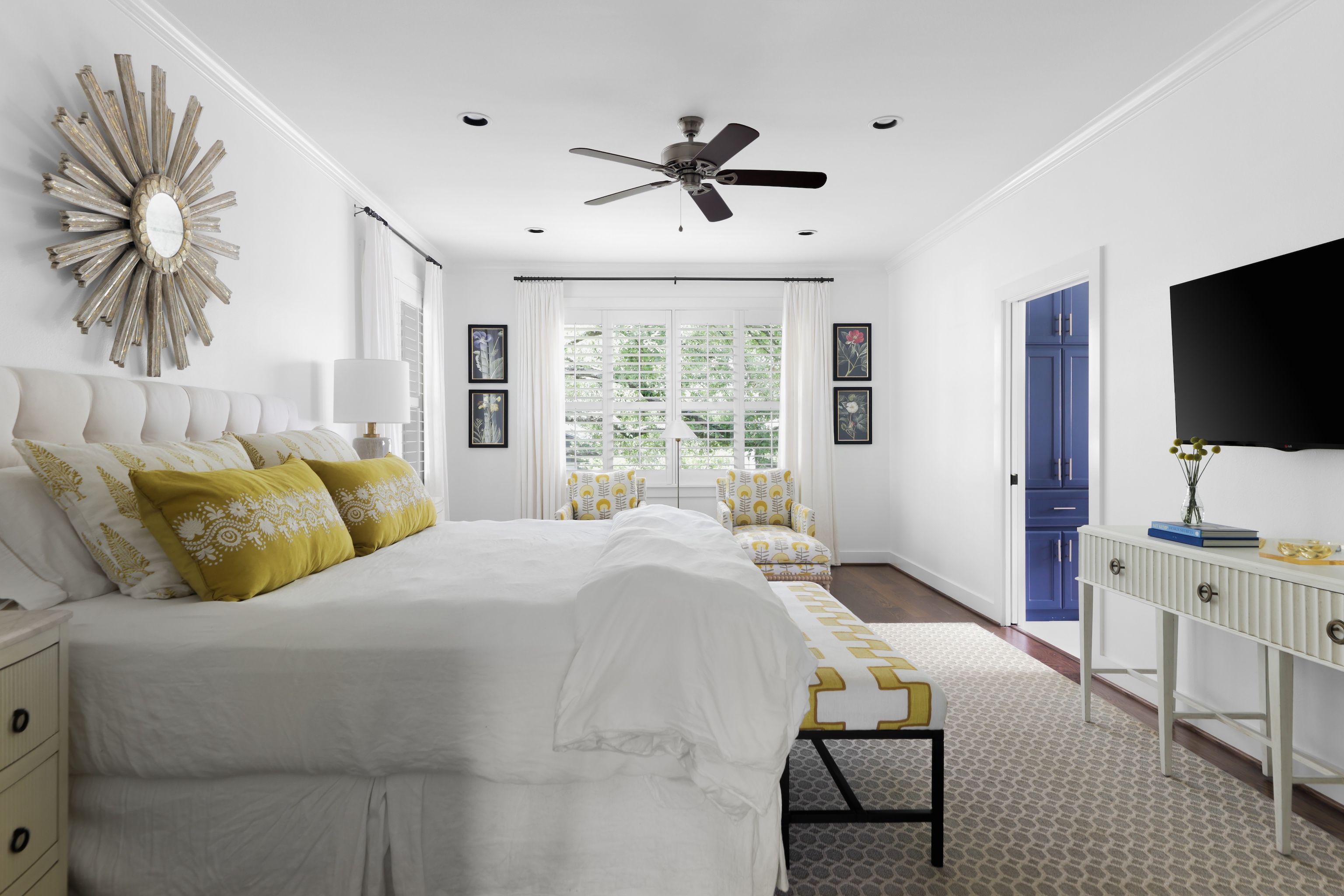 A light filled sitting room or office overlooking the lush front yard includes built-in storage and shelving. The expansive living space is also anchored by millwork including shelving, storage and media area. The kitchen includes a 6-burner gas Wolf range, double ovens, walk-in pantry, plentiful storage and oversized breakfast bar and island. The adjacent dining area includes built-in bench seating – beautifully upholstered in sunny yellow. An entertainer’s delight!