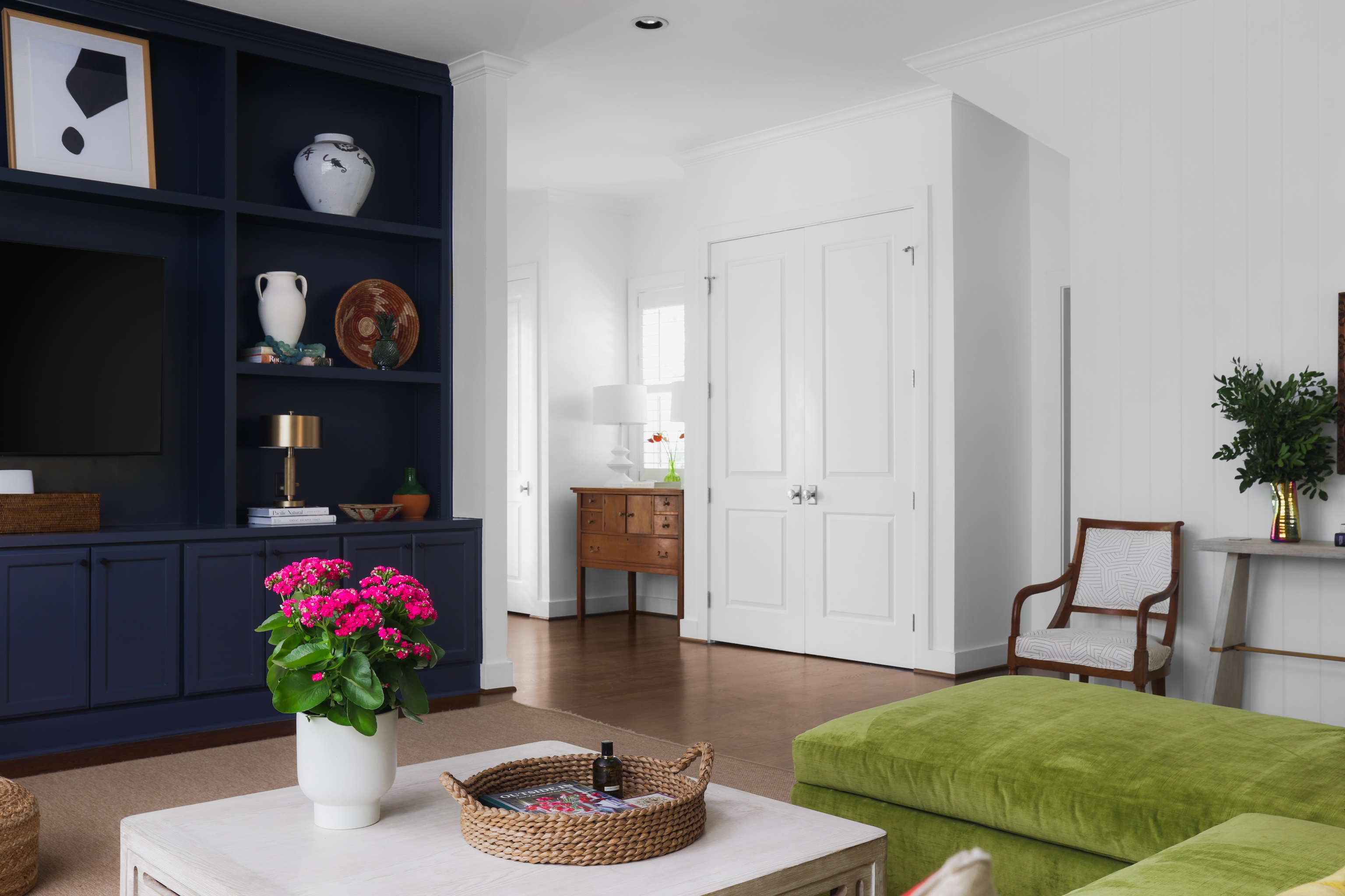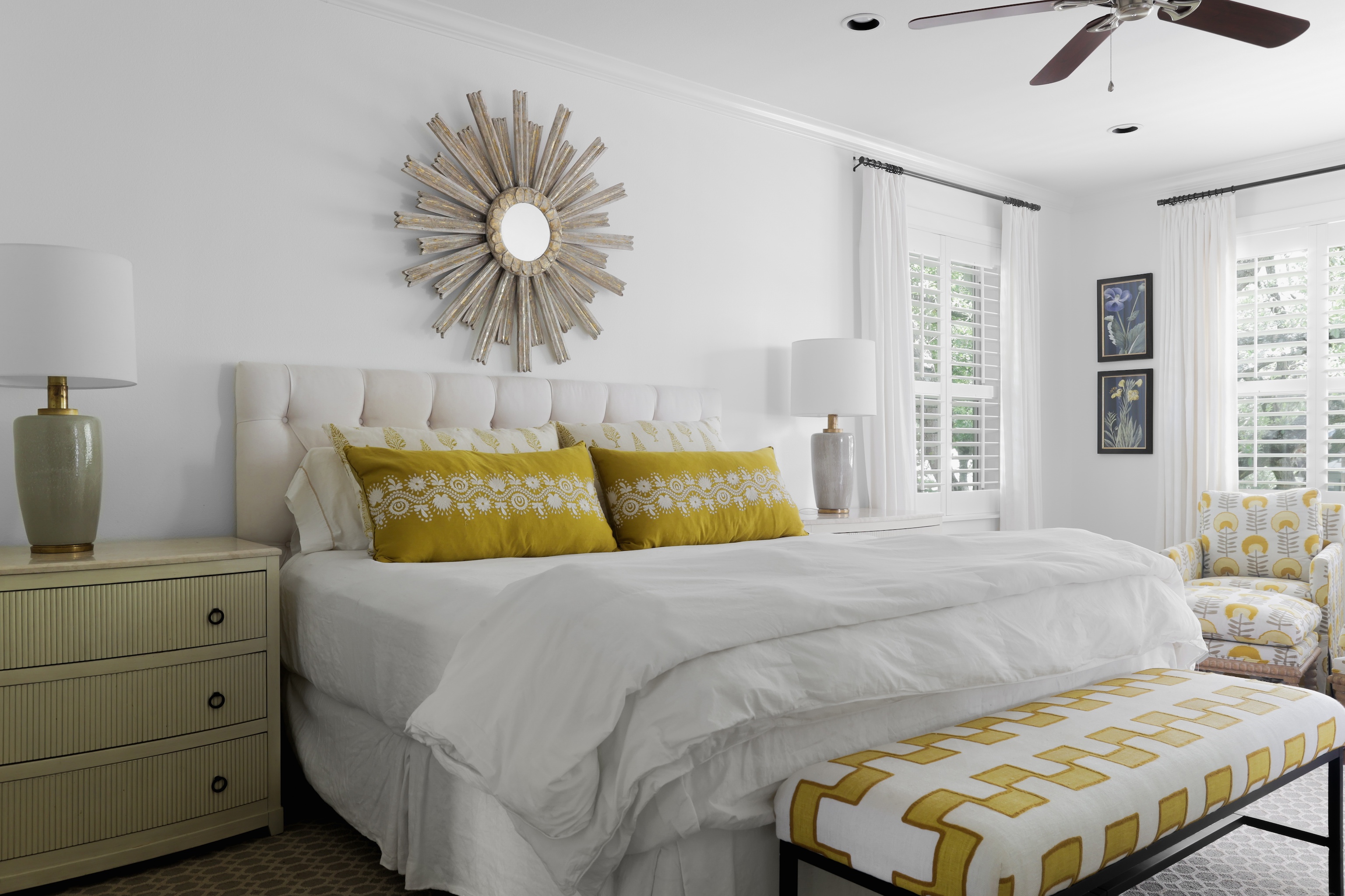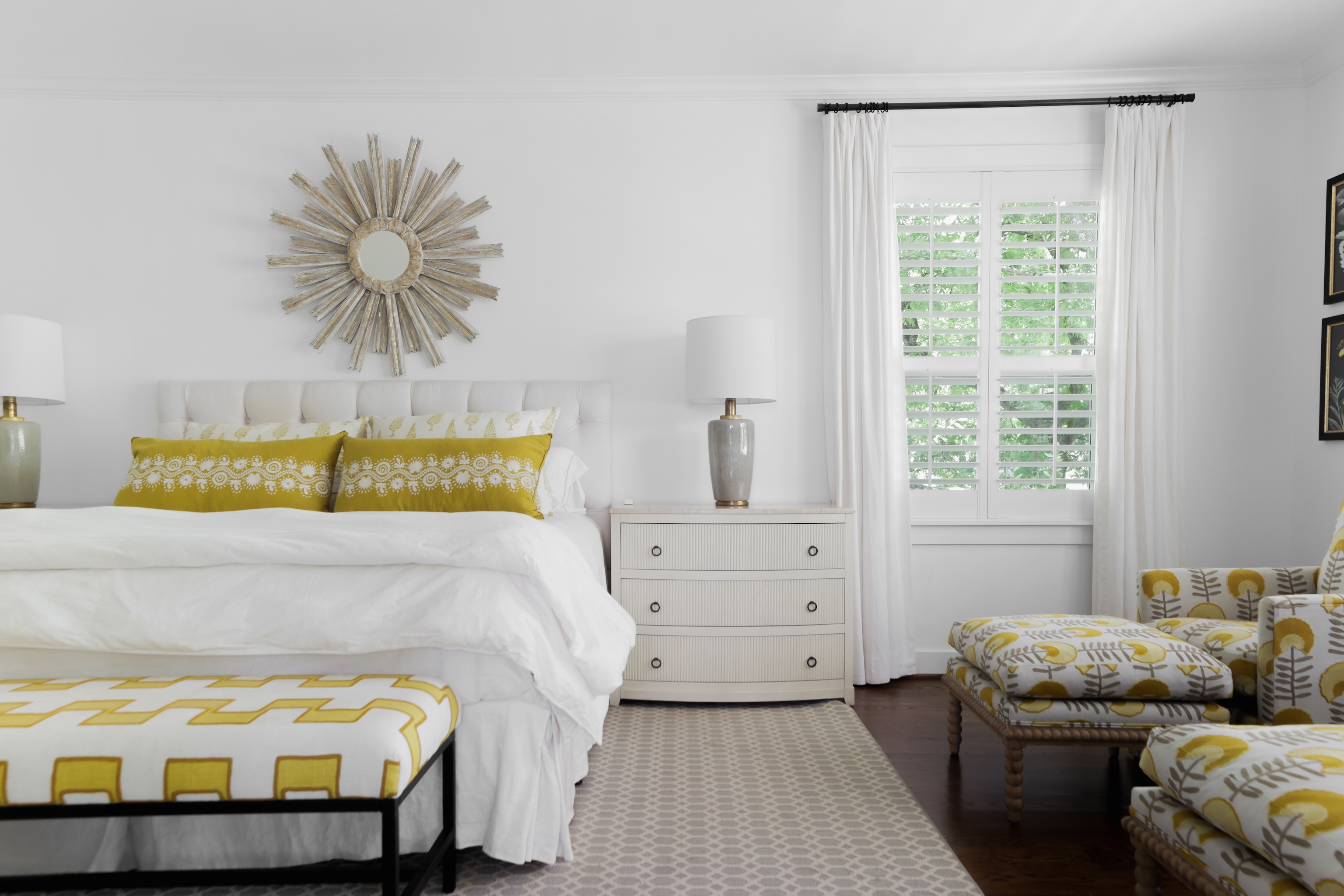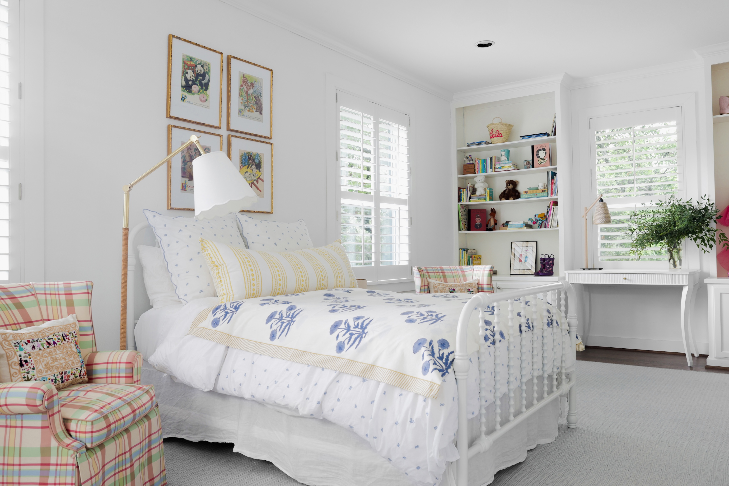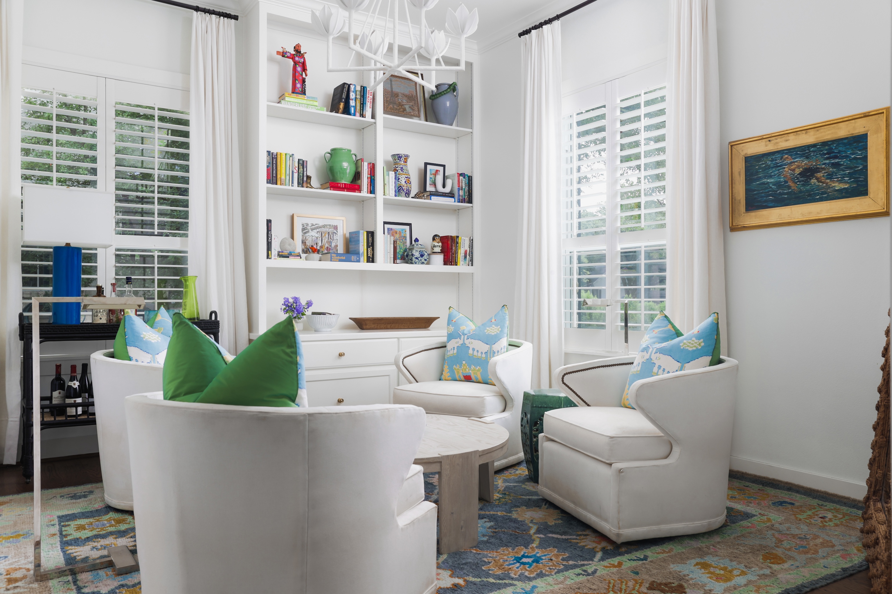 A light filled sitting room or office overlooking the lush front yard includes built-in storage and shelving. The expansive living space is also anchored by millwork including shelving, storage and media area. The kitchen includes a 6-burner gas Wolf range, double ovens, walk-in pantry, plentiful storage and oversized breakfast bar and island. The adjacent dining area includes built-in bench seating – beautifully upholstered in sunny yellow. An entertainer’s delight!