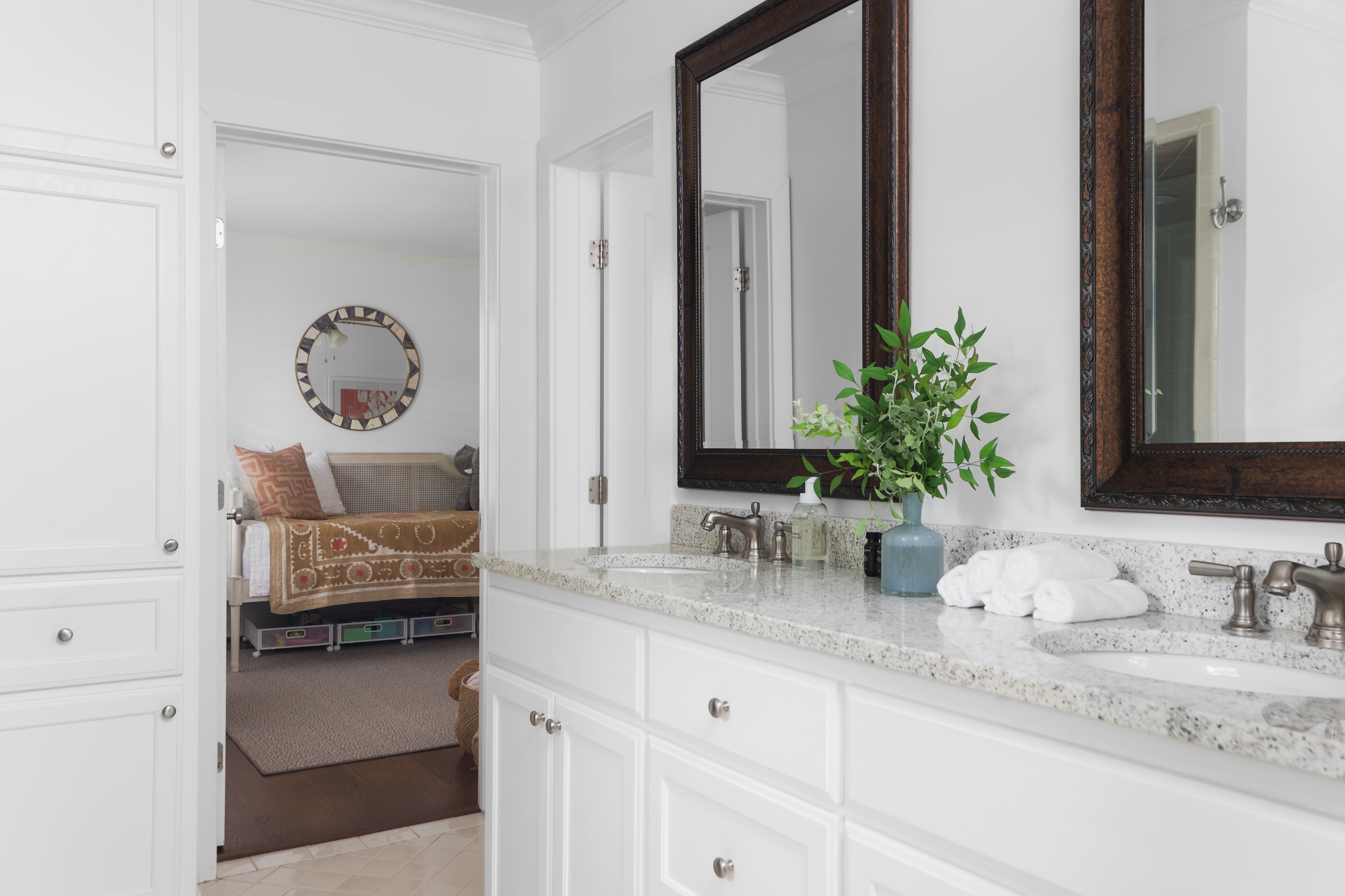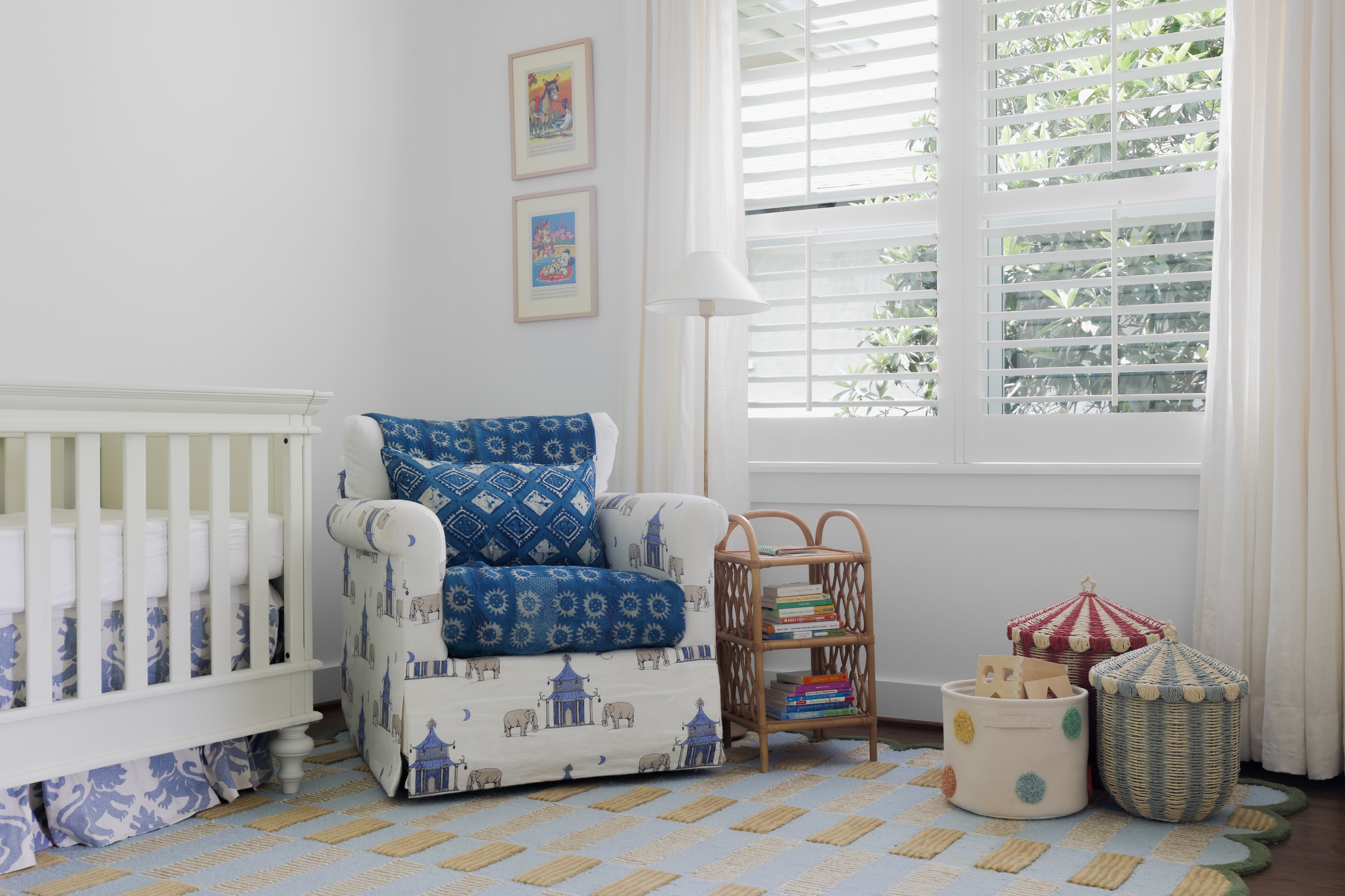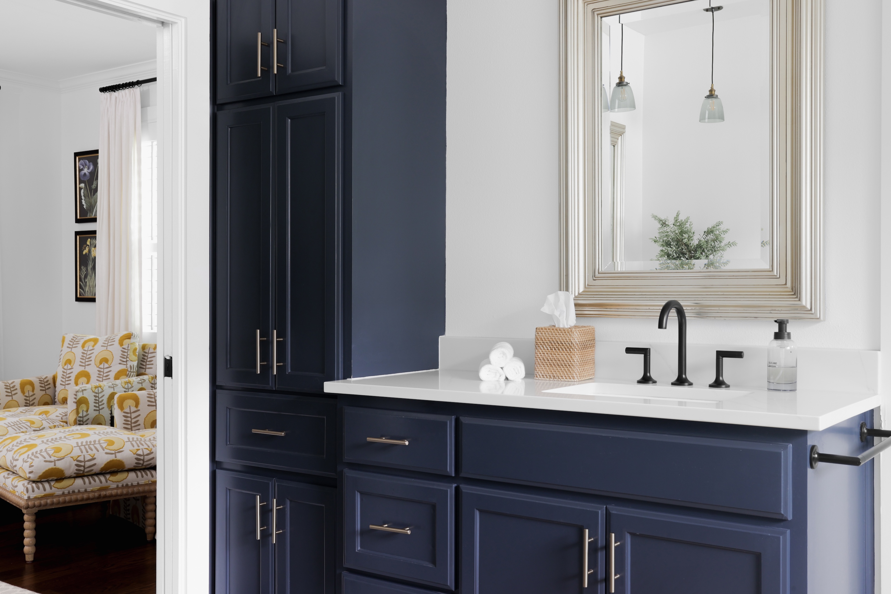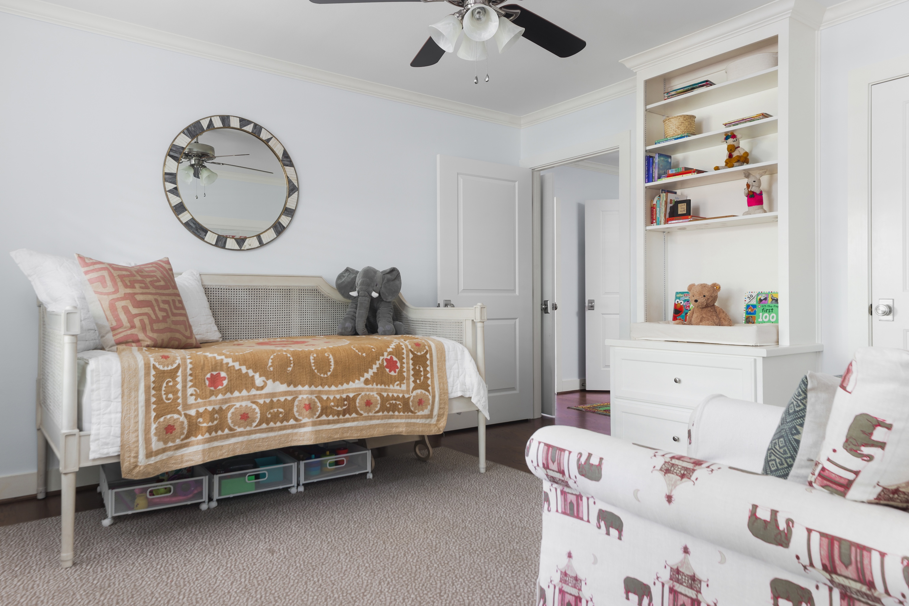 A light filled sitting room or office overlooking the lush front yard includes built-in storage and shelving. The expansive living space is also anchored by millwork including shelving, storage and media area. The kitchen includes a 6-burner gas Wolf range, double ovens, walk-in pantry, plentiful storage and oversized breakfast bar and island. The adjacent dining area includes built-in bench seating – beautifully upholstered in sunny yellow. An entertainer’s delight!