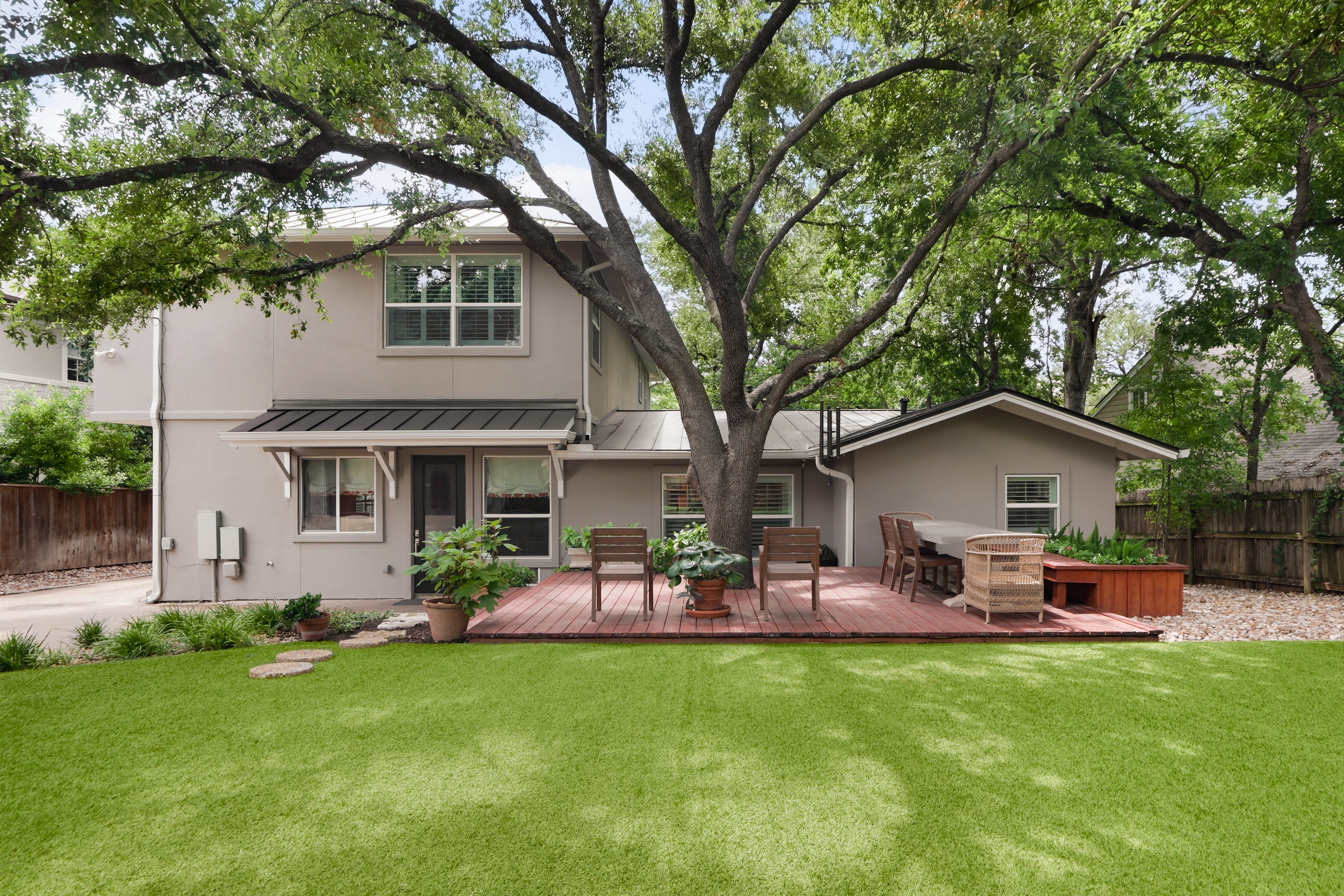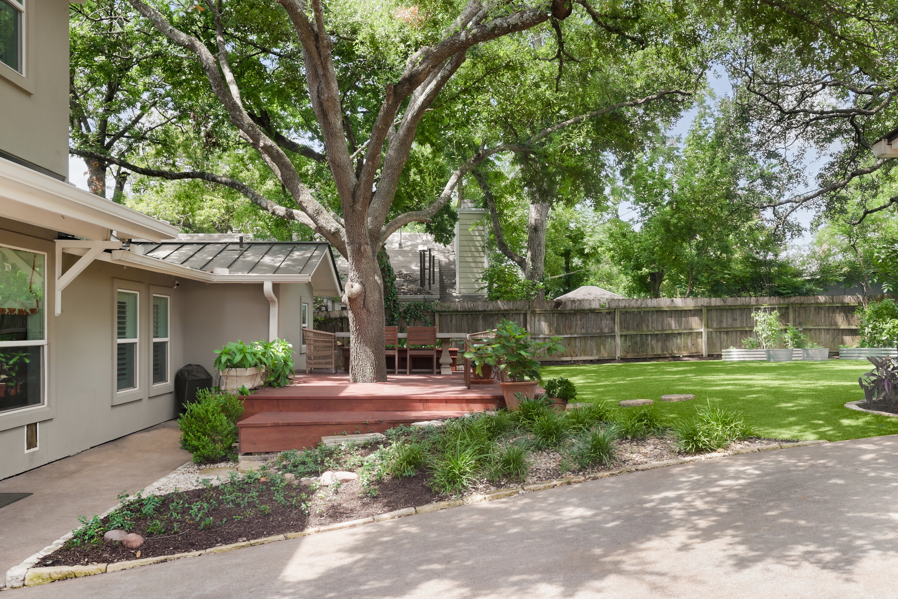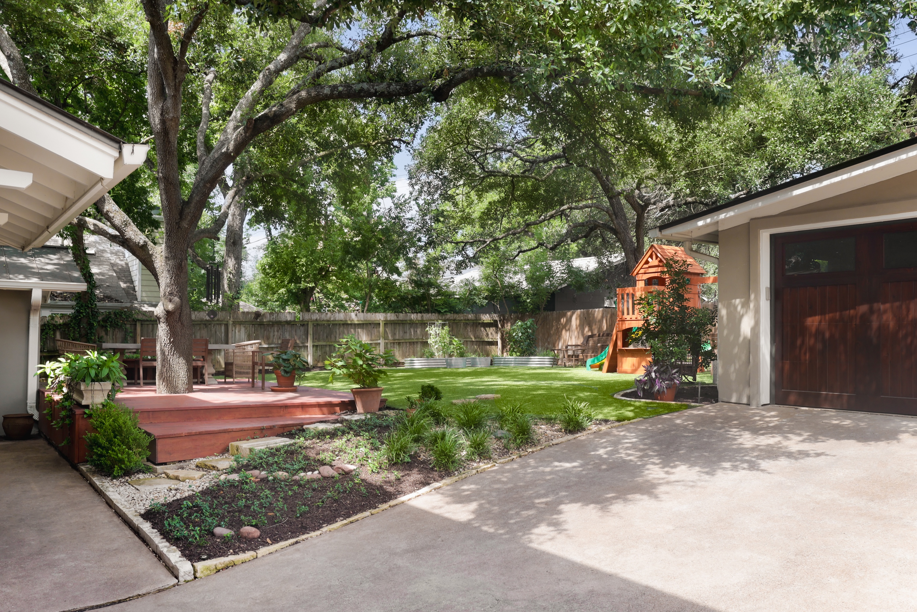 The generously sized turfed backyard has ample room for play, grilling, dining and gardening. A wood deck offers a space for dining al fresco under gorgeous mature trees. The gated driveway leads to a two car garage.