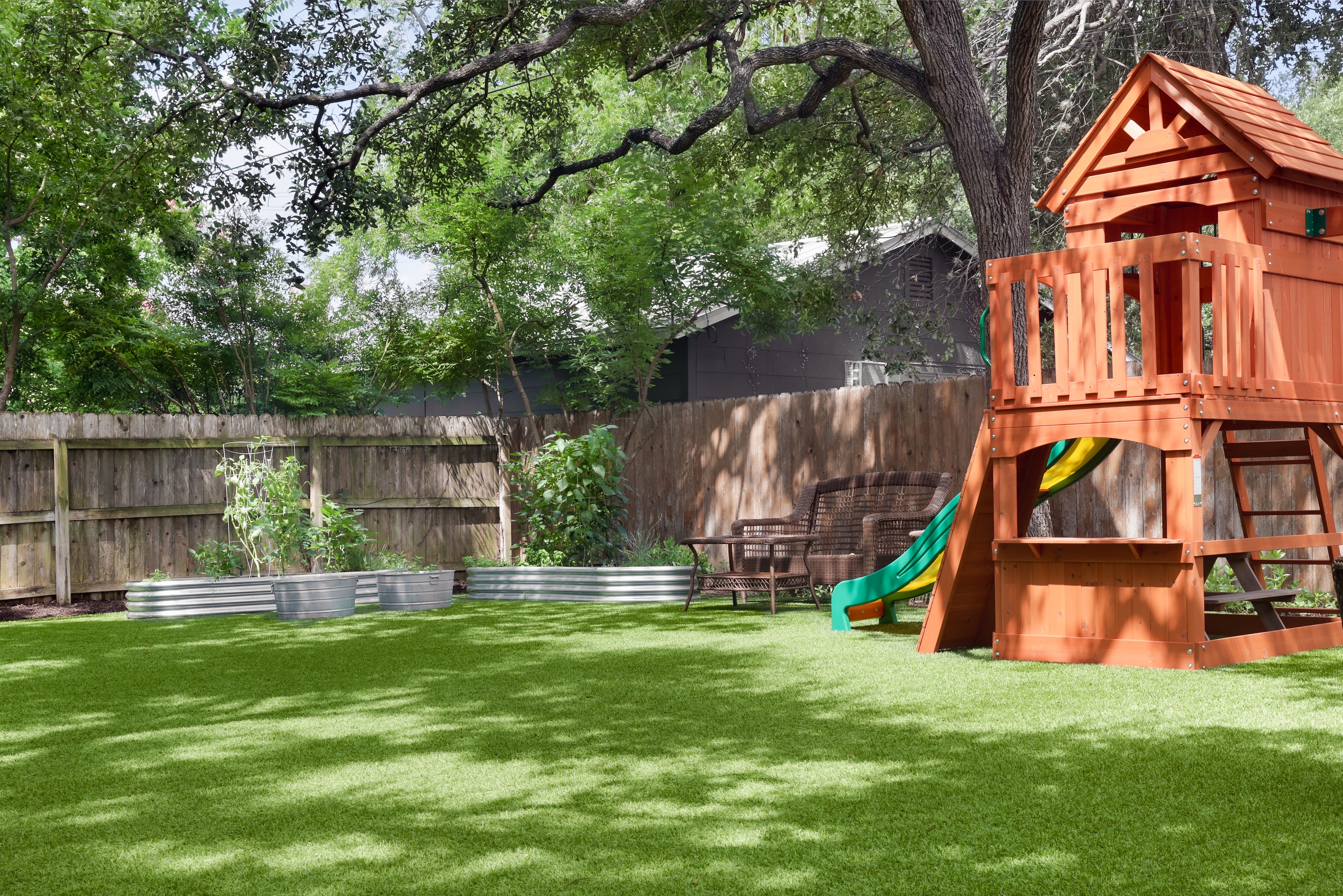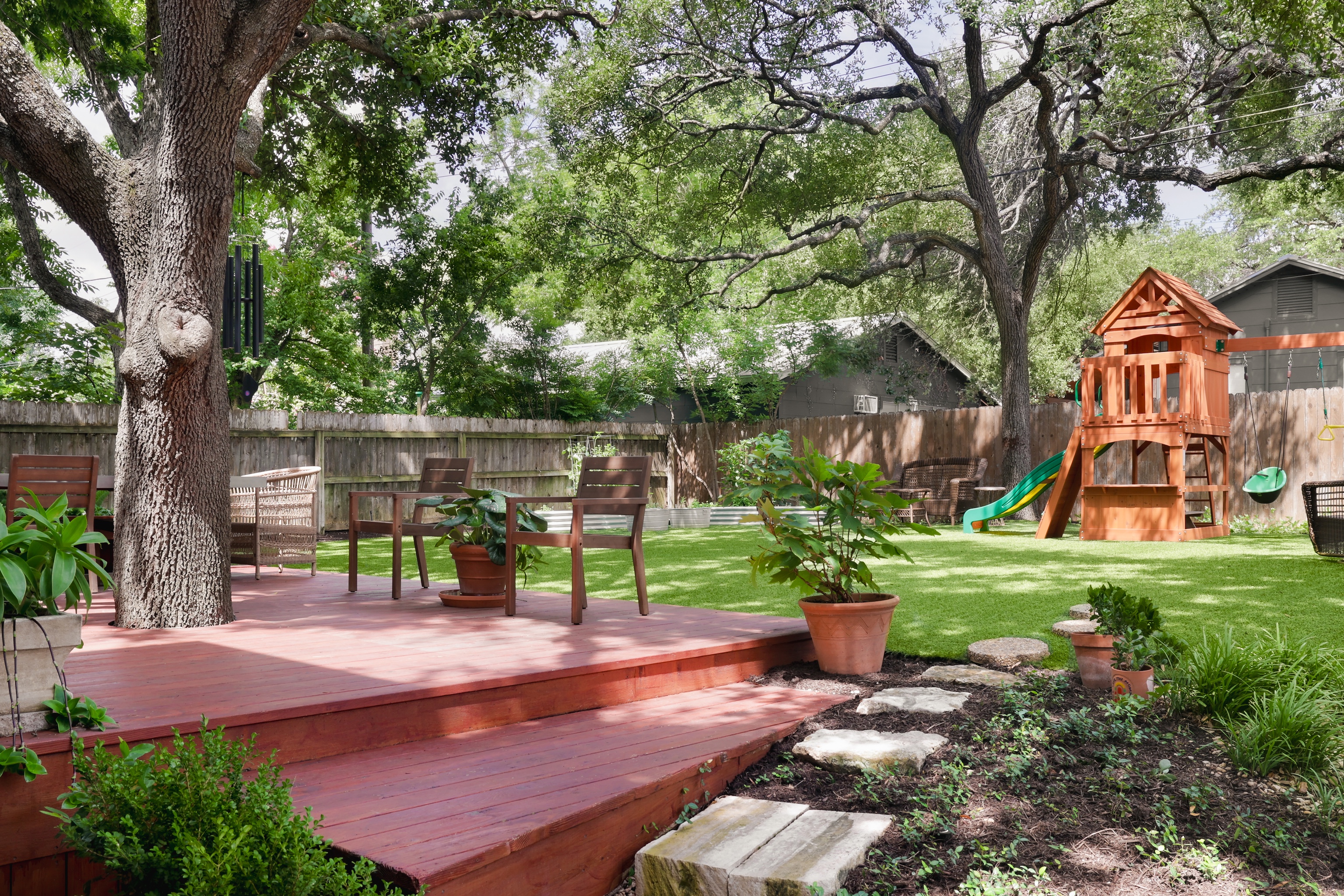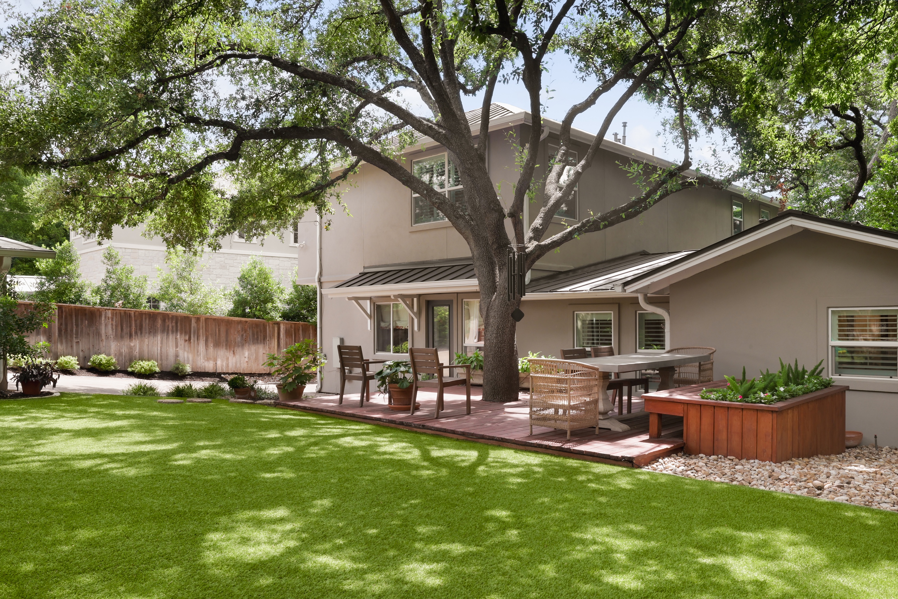 The generously sized turfed backyard has ample room for play, grilling, dining and gardening. A wood deck offers a space for dining al fresco under gorgeous mature trees. The gated driveway leads to a two car garage.